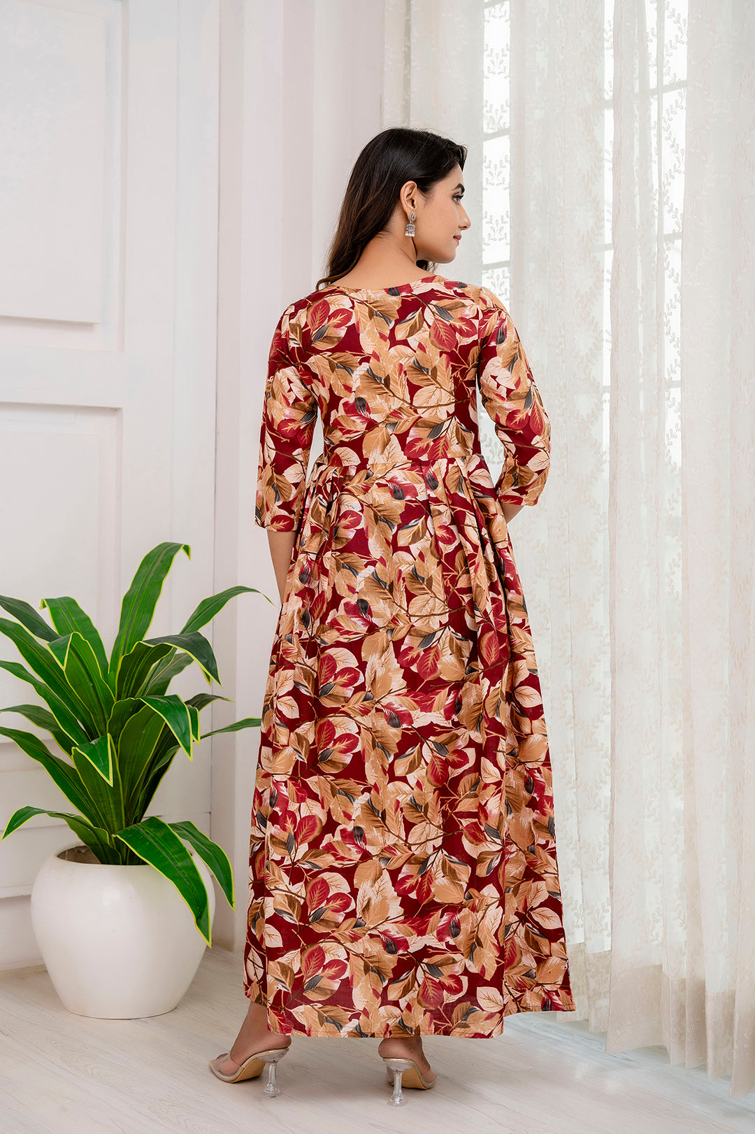 Fab Maroon Abstract Printed Gather Dress For Women