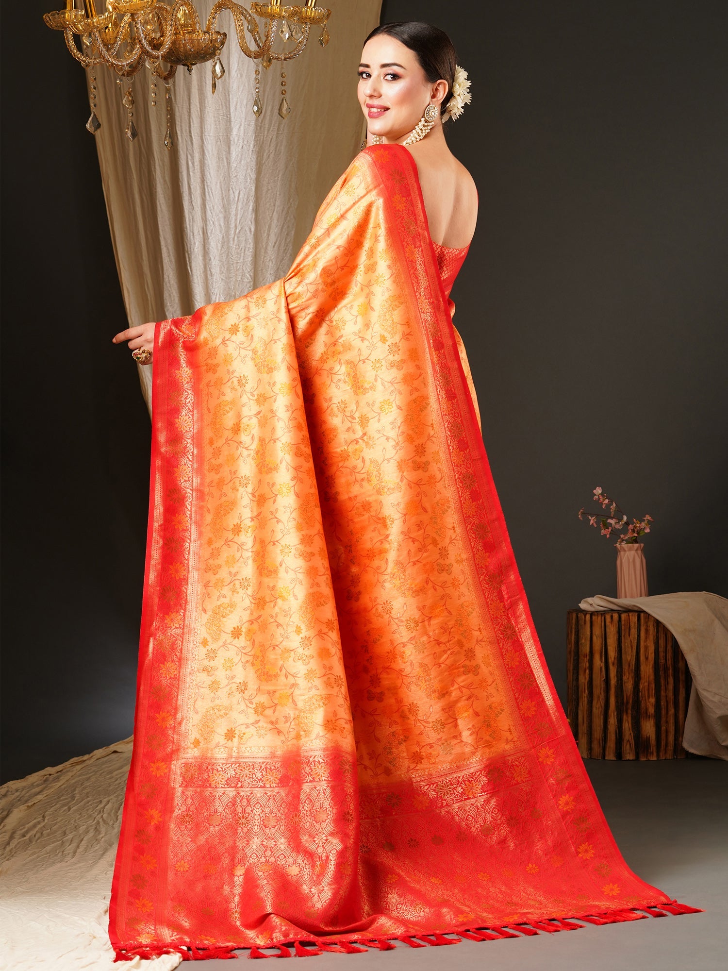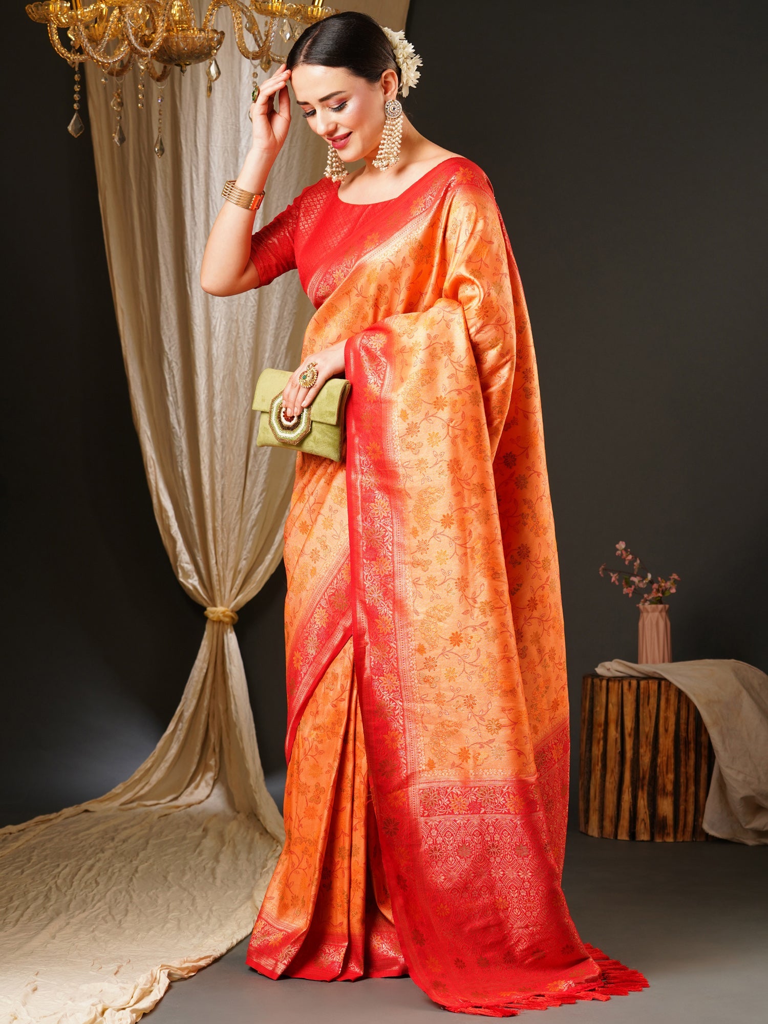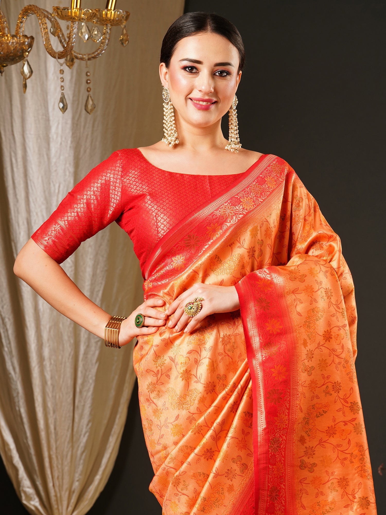 This saree is made from Kanjeevaram Silk and is Peach in color. Our Ethnic Sarees comes With Blouse Piece, Which can be Stitched according to Your Taste and Preference. This Saree is Crafted by Skill Craftsmen without Compromising on its Quality. With This Beautiful Design and Fabric, This Saree will fetch You Oodles of Compliments and Praise. saree fit size is 5.5 mtr saree & 0.8 mtr blouse, Free Size |.