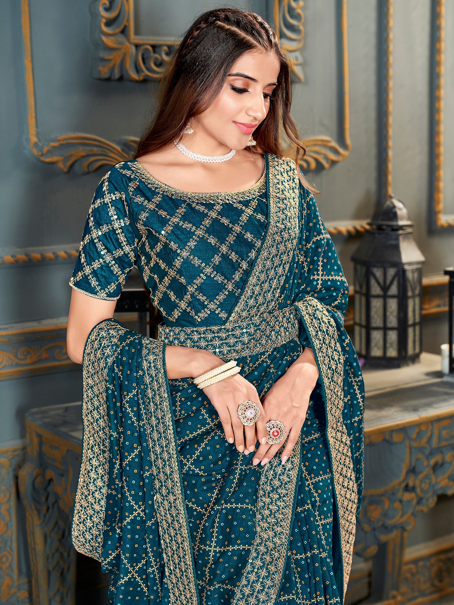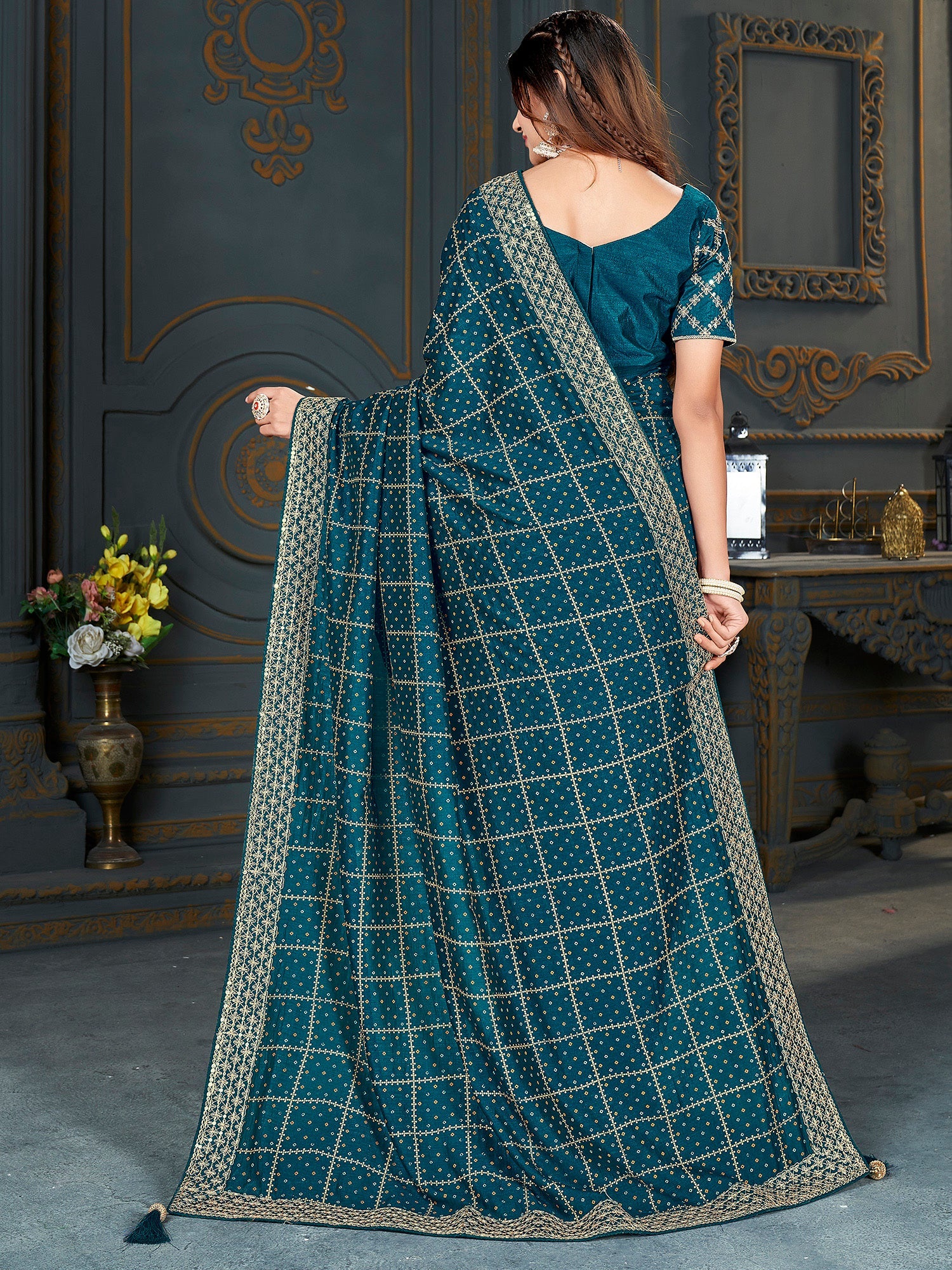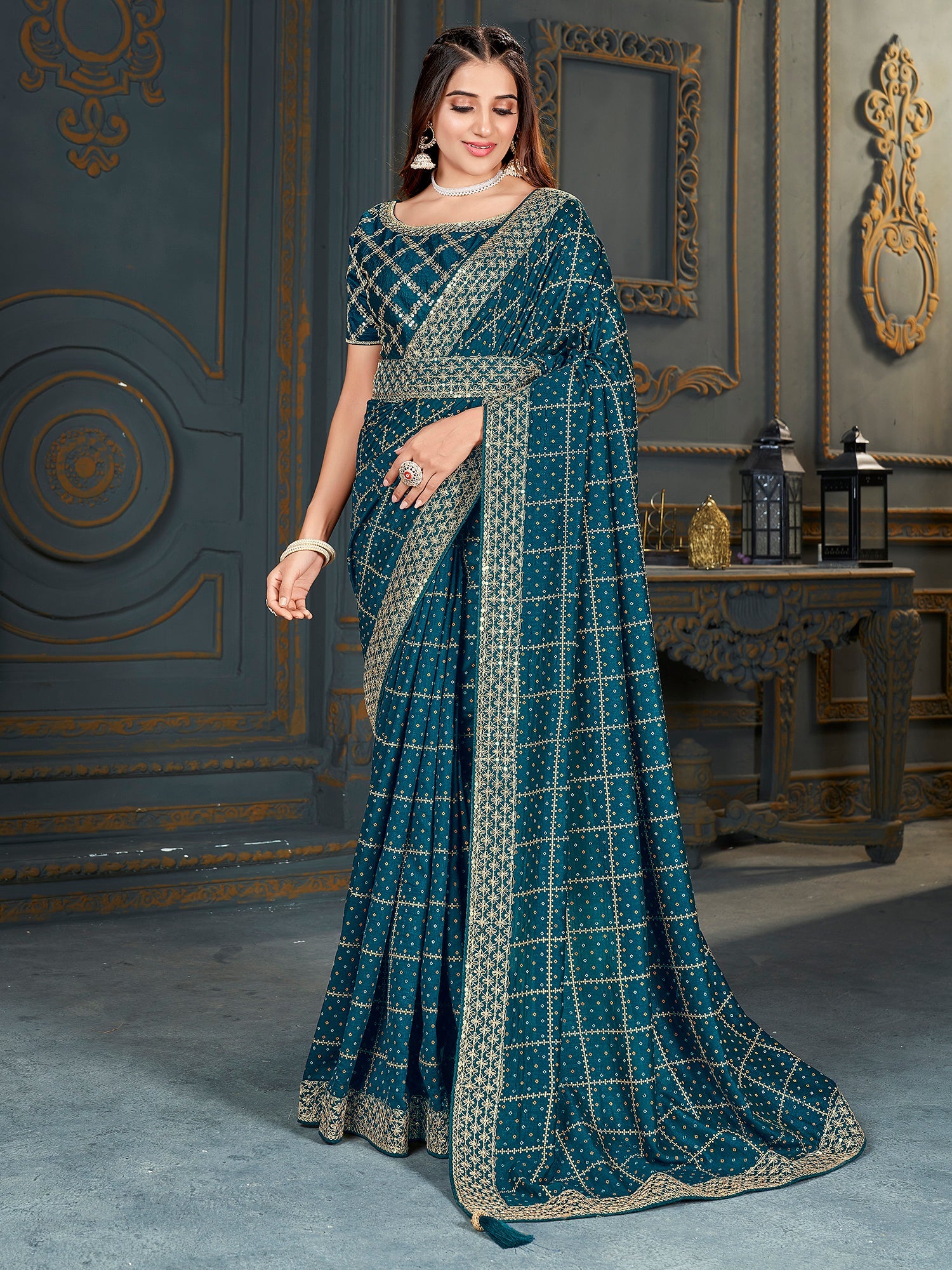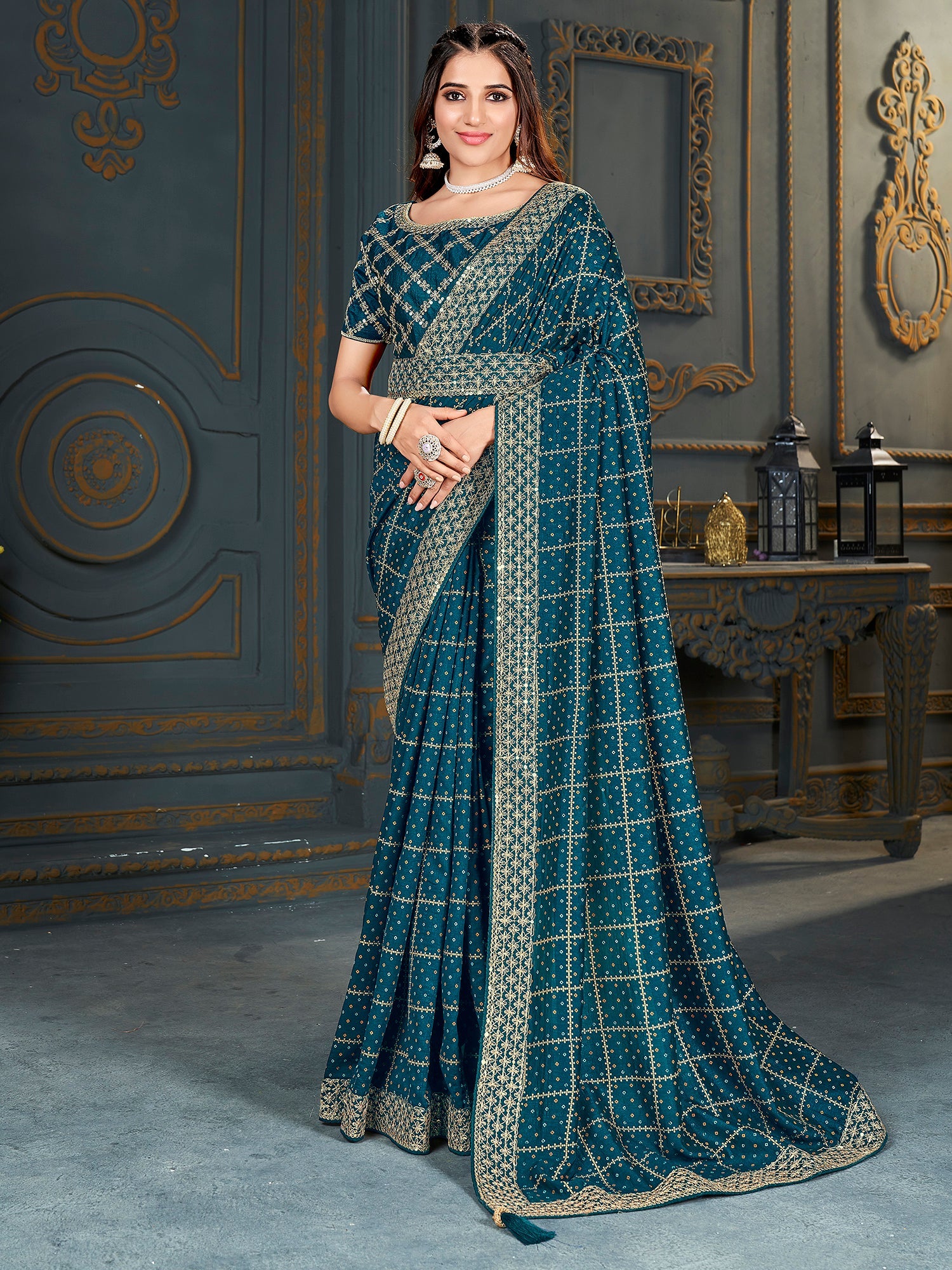 This saree is made from Vichitra Silk and is Teal blue in color. Our Ethnic Sarees comes With Blouse Piece, Which can be Stitched according to Your Taste and Preference. This Saree is Crafted by Skill Craftsmen without Compromising on its Quality. With This Beautiful Design and Fabric, This Saree will fetch You Oodles of Compliments and Praise. saree fit size is 5.5 mtr saree & 0.8 mtr blouse, Free Size |.