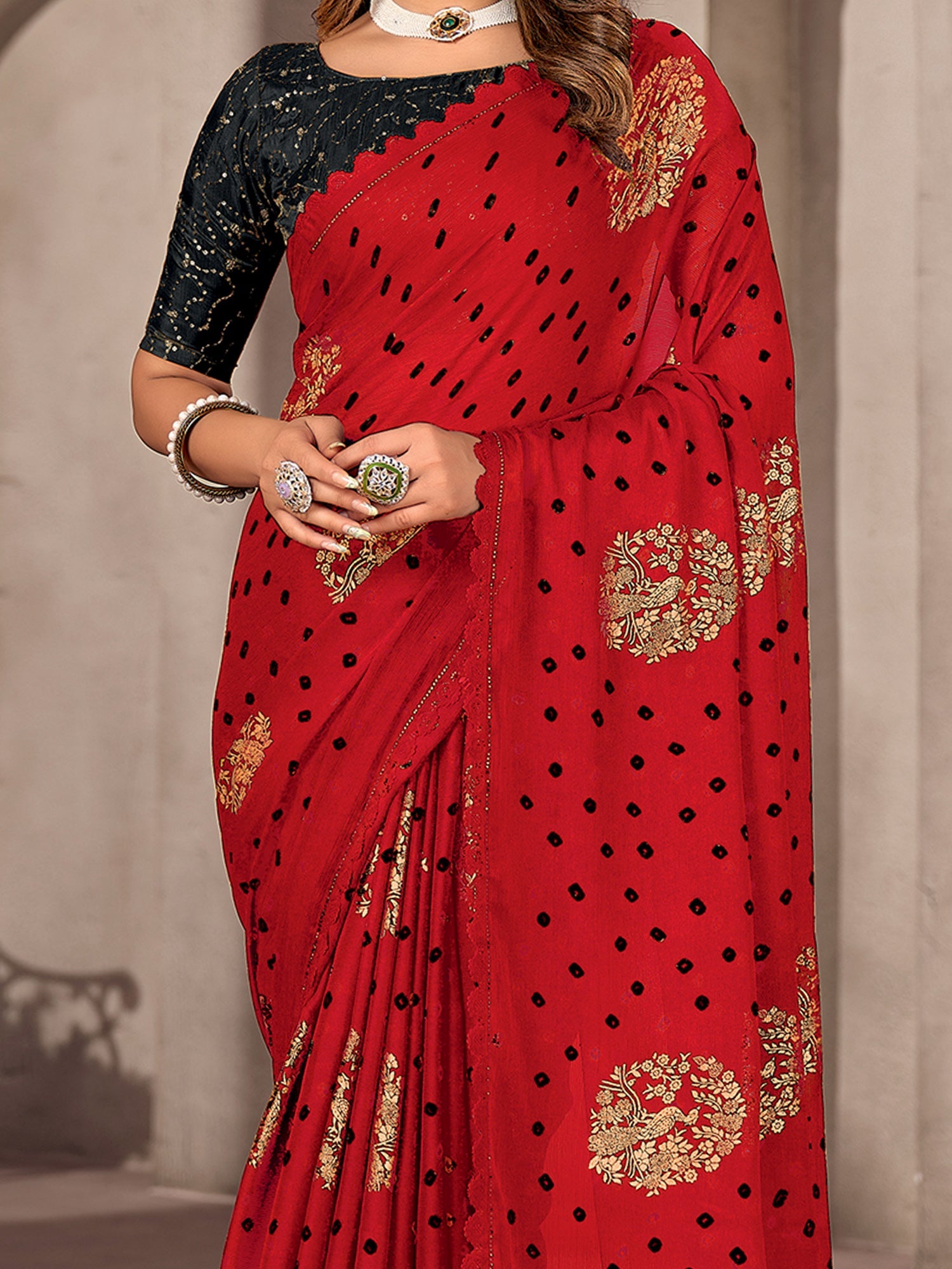 This saree is made from Chiffon and is Red in color. Our Ethnic Sarees comes With Blouse Piece, Which can be Stitched according to Your Taste and Preference. This Saree is Crafted by Skill Craftsmen without Compromising on its Quality. With This Beautiful Design and Fabric, This Saree will fetch You Oodles of Compliments and Praise. saree fit size is 5.5 mtr saree & 0.8 mtr blouse, Free Size |.