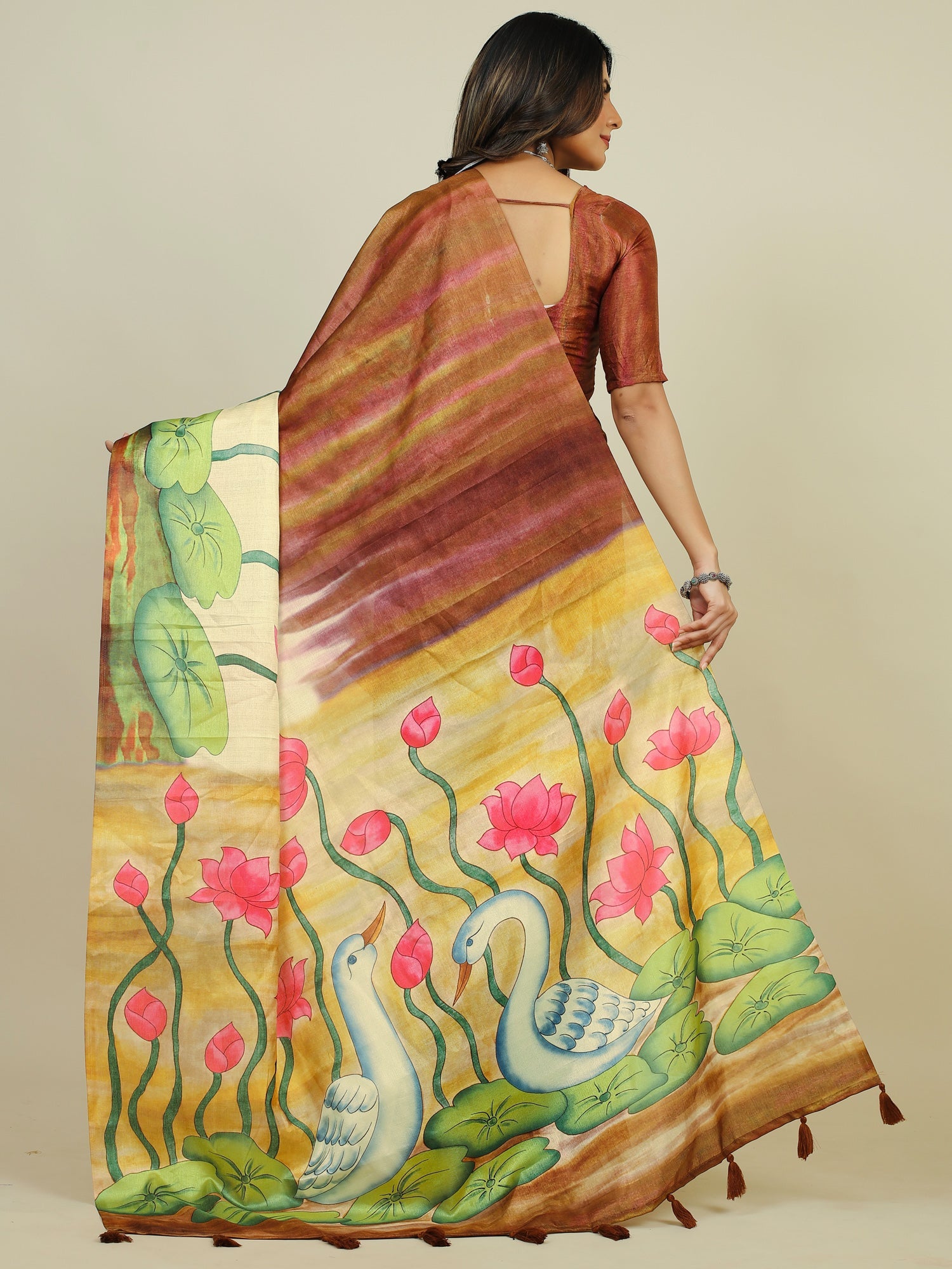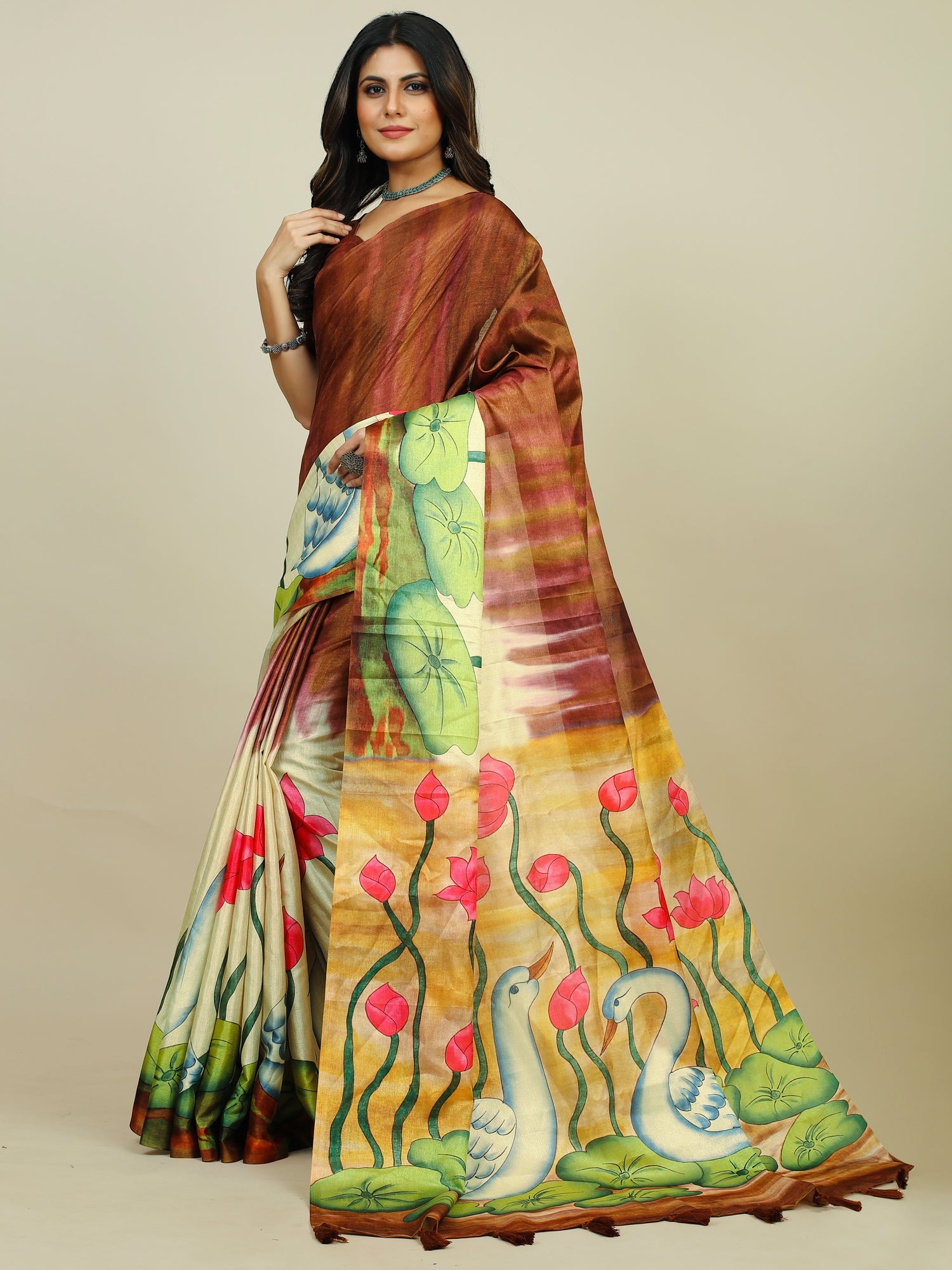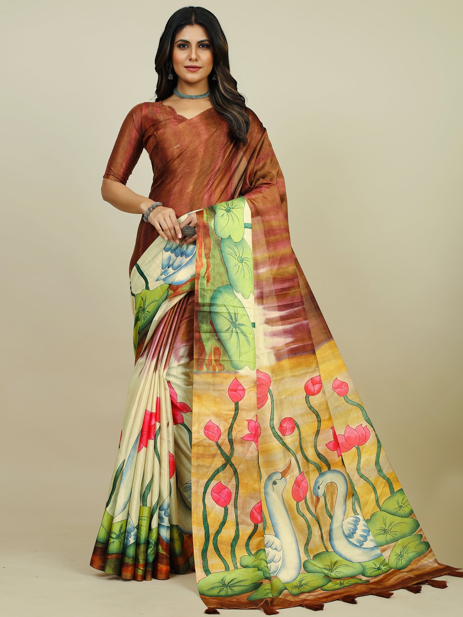 This saree is made from Tussar Silk and is Brown in color. Our Ethnic Sarees comes With Blouse Piece, Which can be Stitched according to Your Taste and Preference. This Saree is Crafted by Skill Craftsmen without Compromising on its Quality. With This Beautiful Design and Fabric, This Saree will fetch You Oodles of Compliments and Praise. saree fit size is 5.5 mtr saree & 0.8 mtr blouse, Free Size |.
