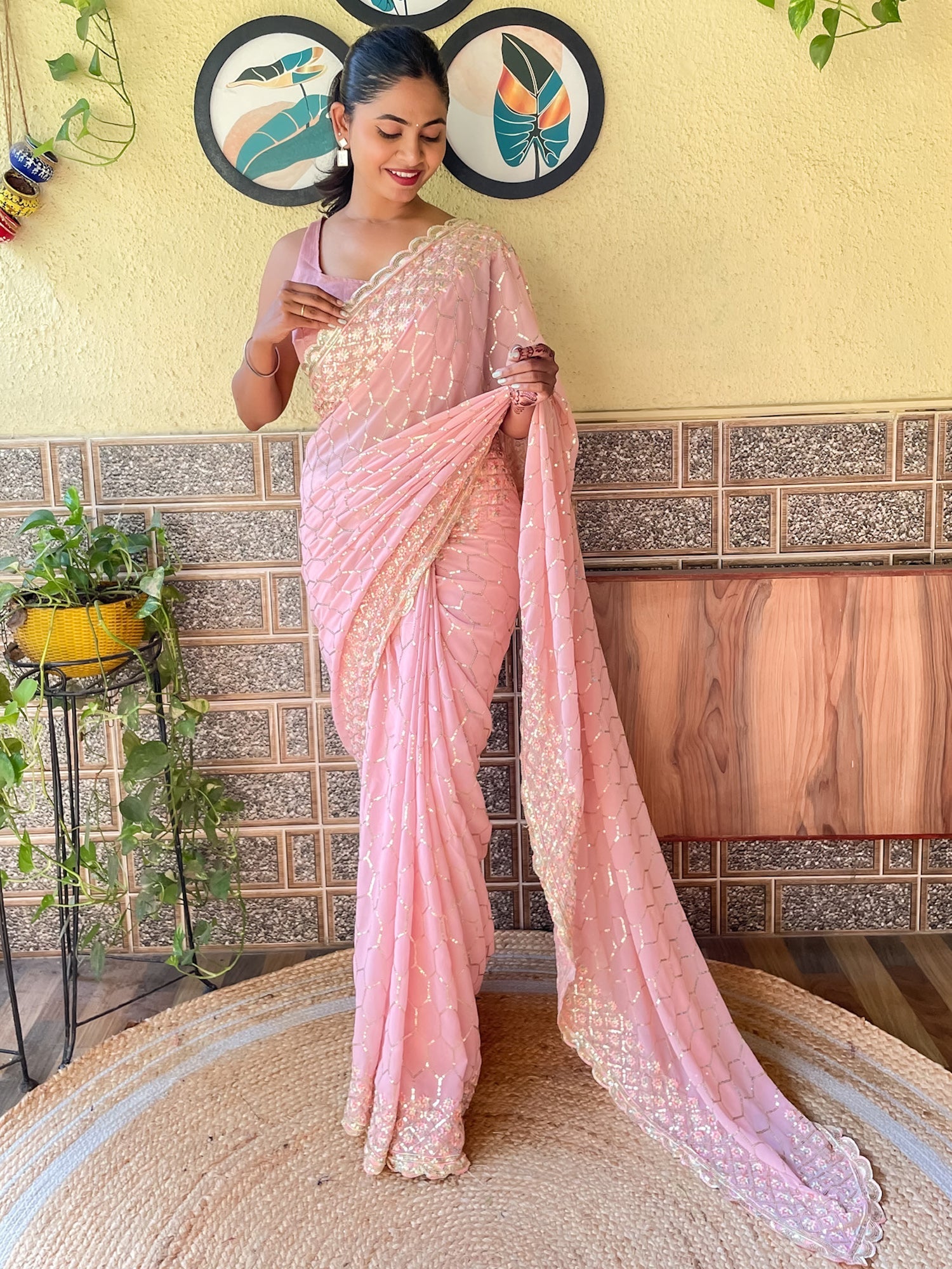 This saree is made from Georgette and is Rose Gold in color. Our Ethnic Sarees comes With Blouse Piece, Which can be Stitched according to Your Taste and Preference. This Saree is Crafted by Skill Craftsmen without Compromising on its Quality. With This Beautiful Design and Fabric, This Saree will fetch You Oodles of Compliments and Praise. saree fit size is 5.5 mtr saree & 0.8 mtr blouse, Free Size |.
