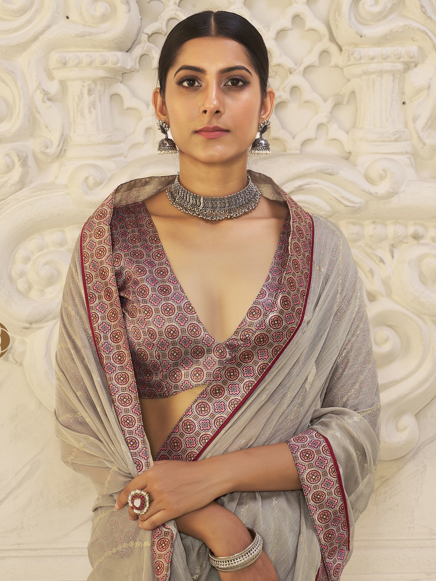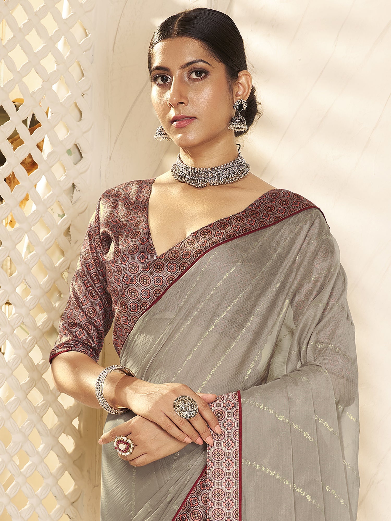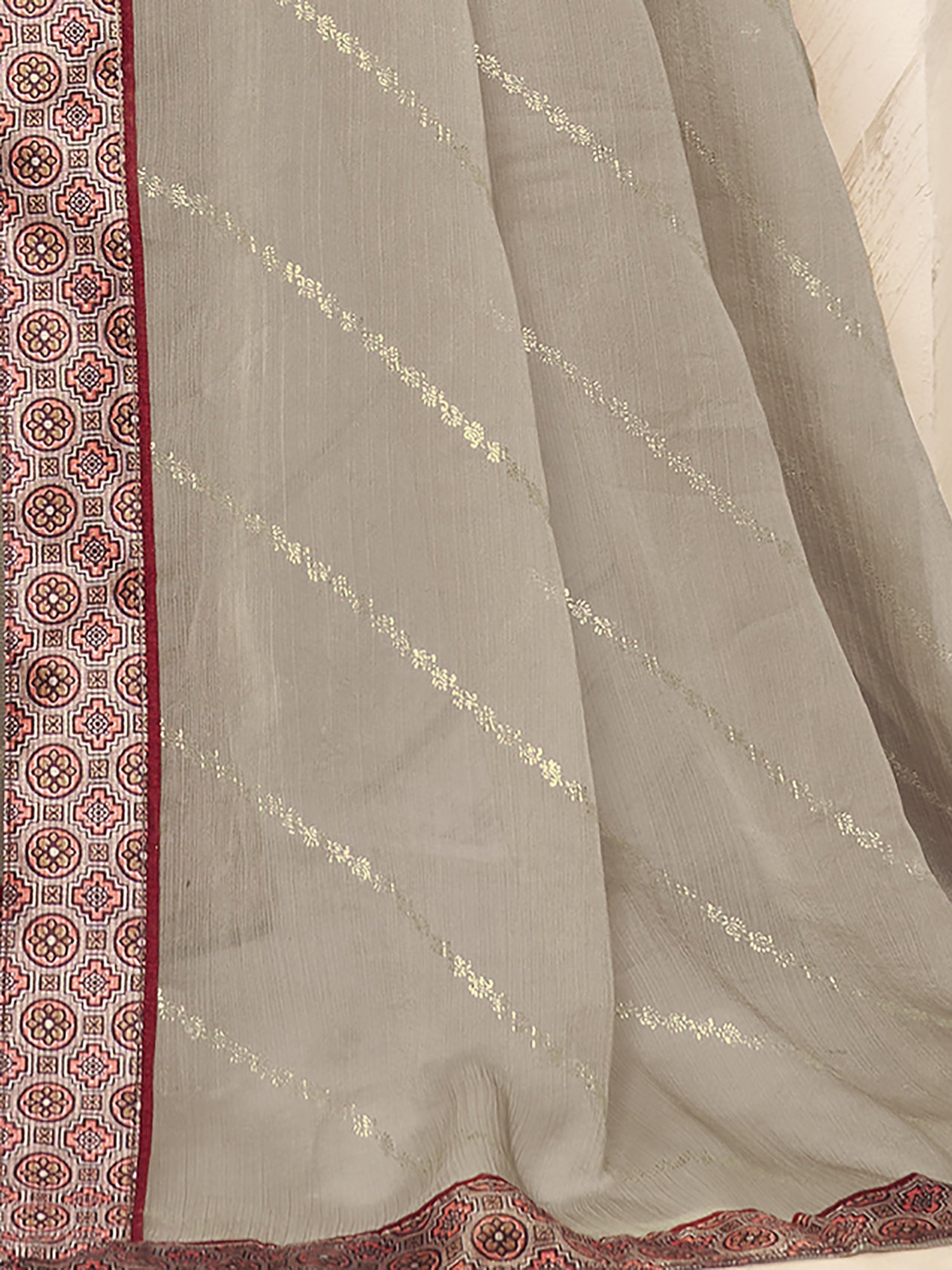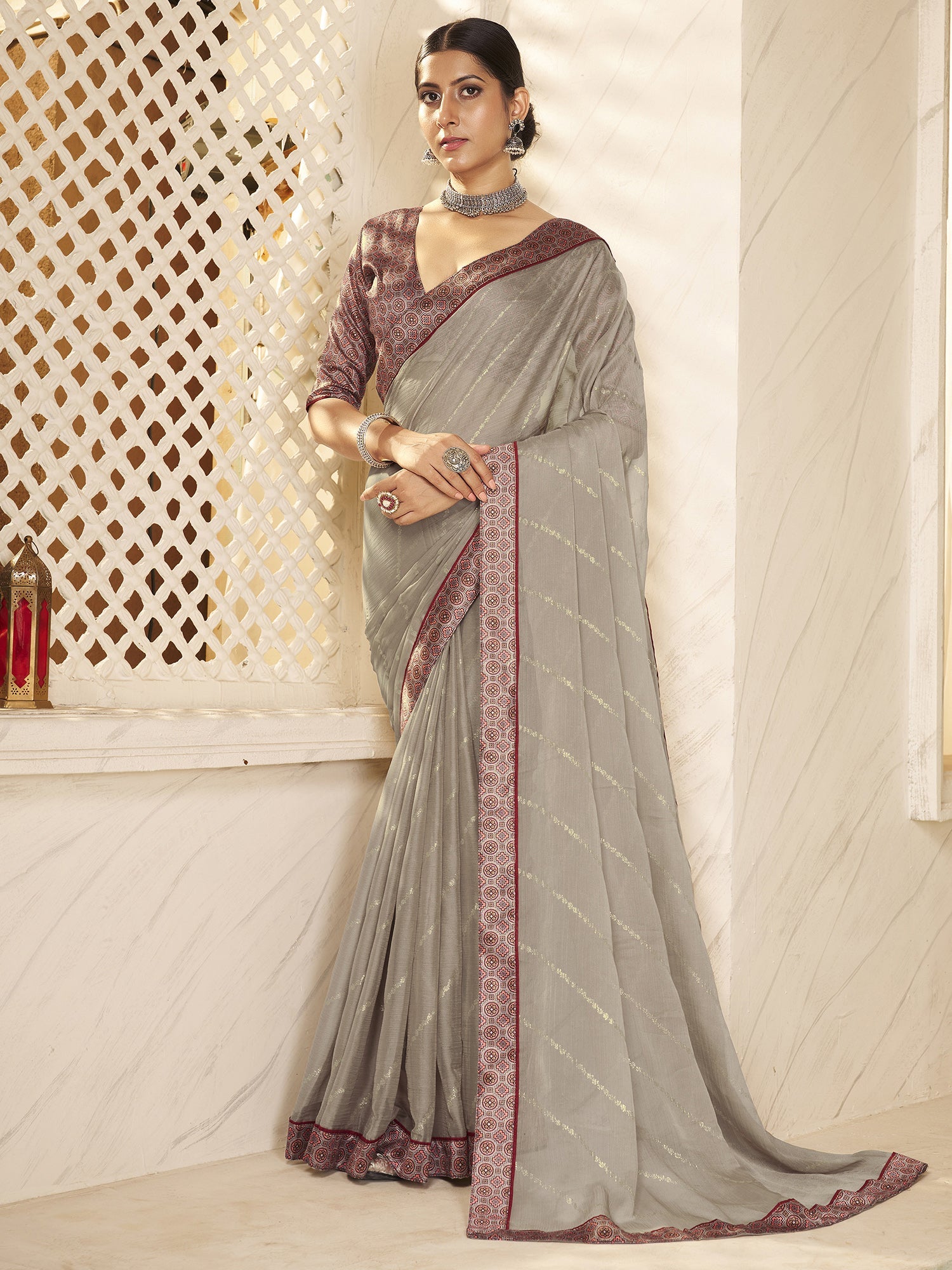 This saree is made from Chiffon and is Grey in color. Our Ethnic Sarees comes With Blouse Piece, Which can be Stitched according to Your Taste and Preference. This Saree is Crafted by Skill Craftsmen without Compromising on its Quality. With This Beautiful Design and Fabric, This Saree will fetch You Oodles of Compliments and Praise. saree fit size is 5.5 mtr saree & 0.8 mtr blouse, Free Size |.