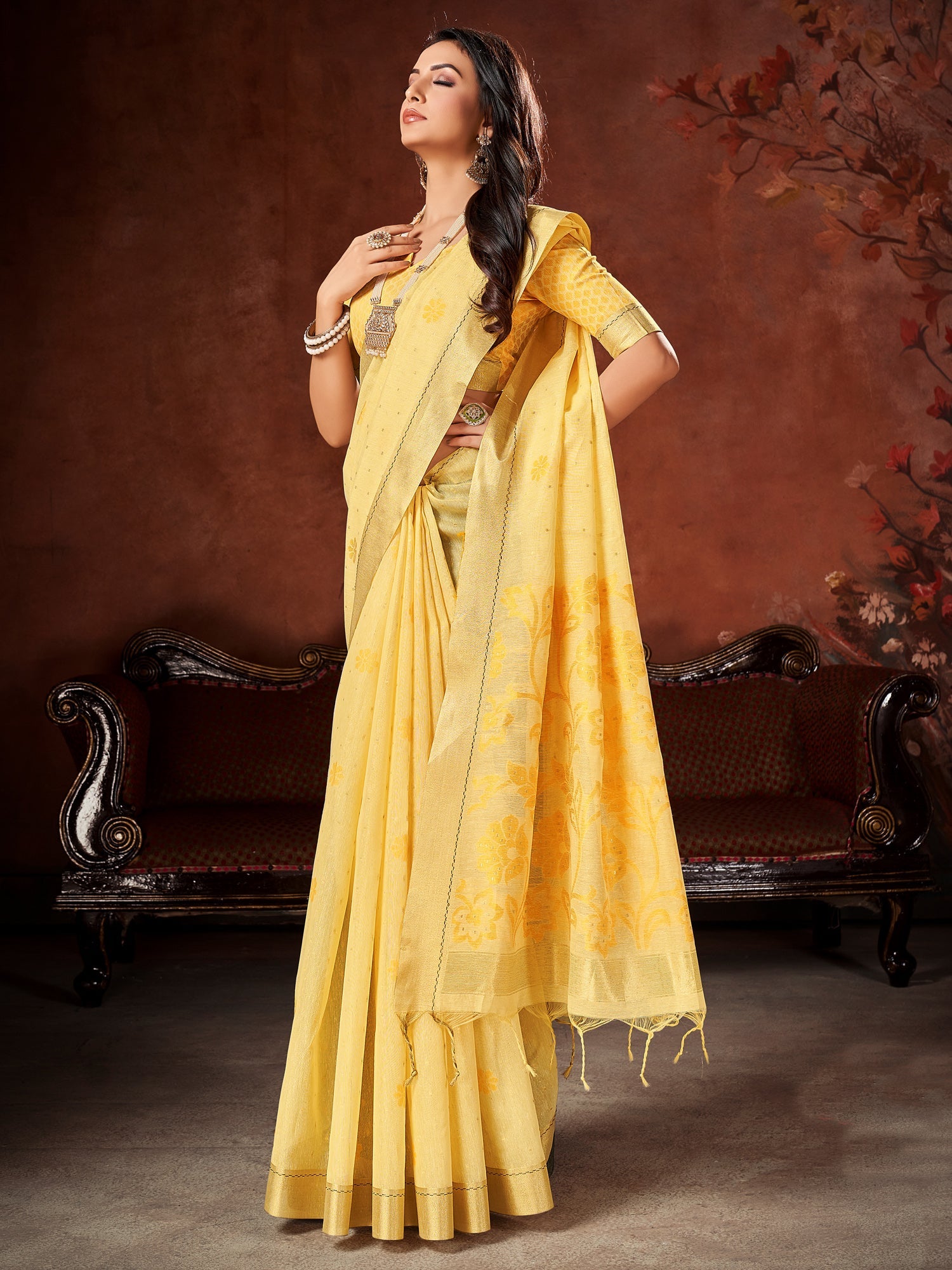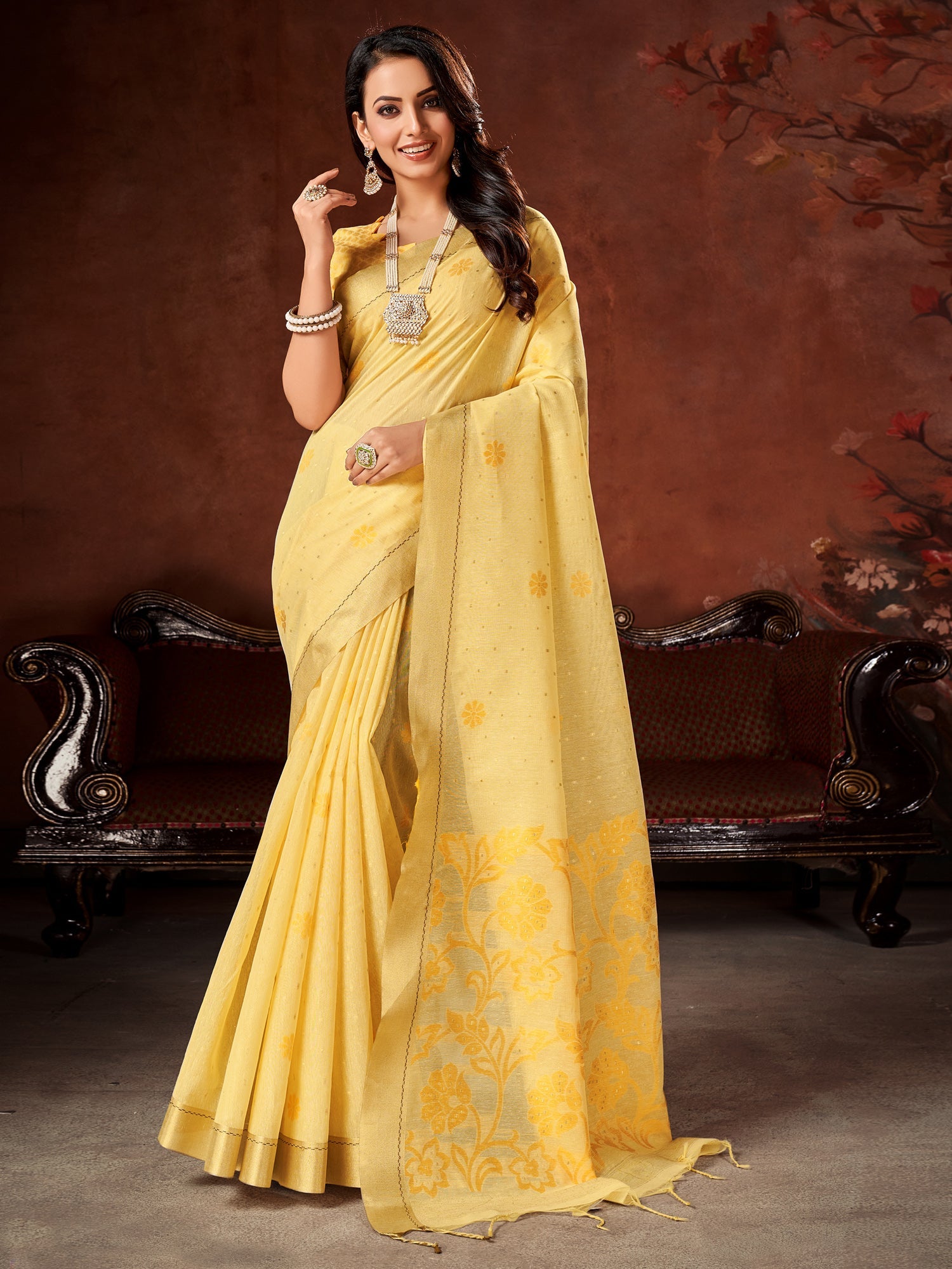This saree is made from Cotton Blend and is Yellow in color. Our Ethnic Sarees comes With Blouse Piece, Which can be Stitched according to Your Taste and Preference. This Saree is Crafted by Skill Craftsmen without Compromising on its Quality. With This Beautiful Design and Fabric, This Saree will fetch You Oodles of Compliments and Praise. saree fit size is 5.5 mtr saree & 0.8 mtr blouse, Free Size |.